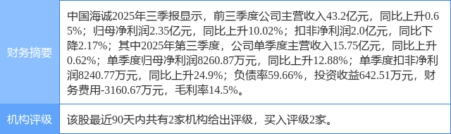 2025年8月14日,中国银河研究员龙天光发布了对中国海诚的研报《业绩稳中有升,积极开拓海外市场》,该研报对中国海诚给出“买入”评级。研报中预计公司2025-2027年归母净利润分别为3.55、3.82、4.21亿元,分别同比+5.91%/+7.51%/+10.33%,对应P/E分别为14.07/13.08/11.86倍,维持“推荐”评级。证券之星数据中心根据近三年发布的研报数据计算,该研报作者对此股的盈利预测准确度为98.94%。