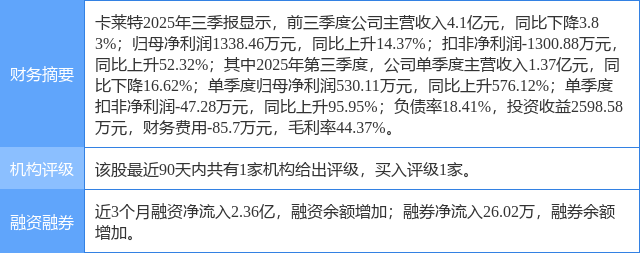 2025年10月31日,太平洋研究员曹佩,王景宜发布了对卡莱特的研报《现金流大幅改善,成立合资公司聚焦AI算力》,该研报对卡莱特给出“买入”评级。研报中预测公司2025-2027年营业收入分别为7.45、8.76、10.59亿元,归母净利润分别为0.32、0.59、1.24亿元。维持“买入”评级。证券之星数据中心根据近三年发布的研报数据计算,该研报作者对此股的盈利预测准确度为19.48%。