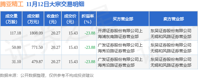 证券之星消息,11月12日腾亚精工发生大宗交易,交易数据如下: