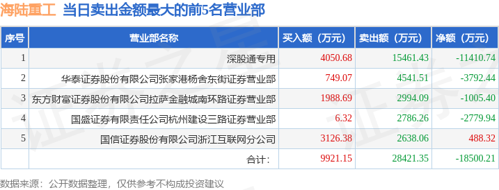 证券之星消息,沪深交易所2025年11月12日公布的交易公开信息显示,海陆重工(002255)因日跌幅偏离值达到7%的前5只证券登上龙虎榜。此次是近5个交易日内第4次上榜。