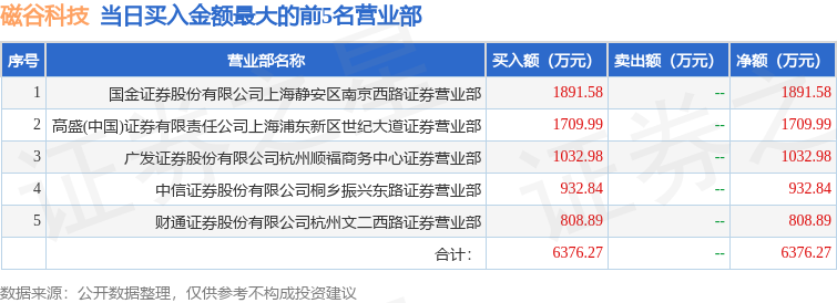 证券之星消息,沪深交易所2025年11月12日公布的交易公开信息显示,磁谷科技(688448)因有价格涨跌幅限制的日换手率达到30%的前五只证券登上龙虎榜。此次是近5个交易日内第2次上榜。