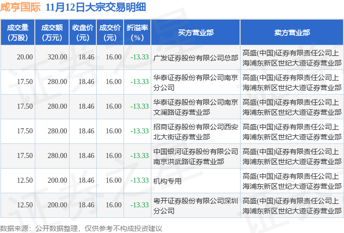 证券之星消息,11月12日咸亨国际发生大宗交易,交易数据如下: