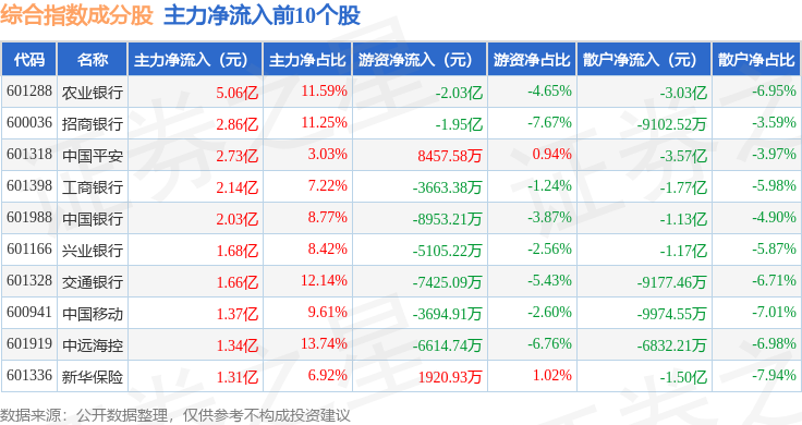 资金流向方面,综合指数(000008)成份股当日主力资金净流出合计19.08亿元,游资资金净流入合计9.59亿元,散户资金净流入合计9.48亿元。成份股资金流向详情见下表: