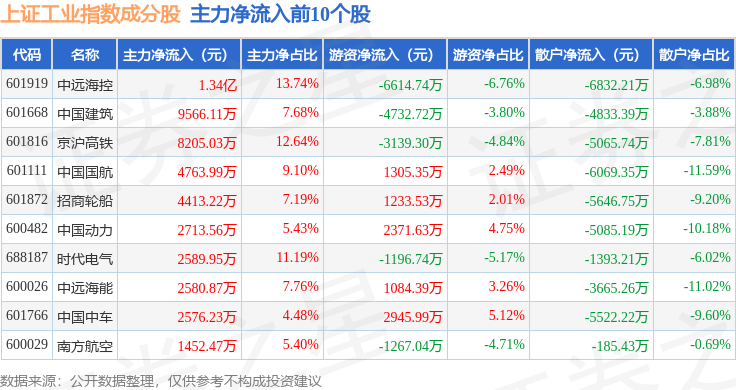 资金流向方面,上证工业(000034)指数成份股当日主力资金净流出合计60.78亿元,游资资金净流入合计13.87亿元,散户资金净流入合计46.91亿元。成份股资金流向详情见下表:
