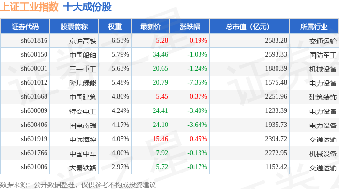 上证工业(000034)指数十大成份股详情如下: