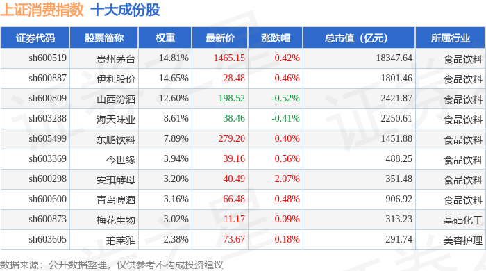 上证消费(000036)指数十大成份股详情如下: