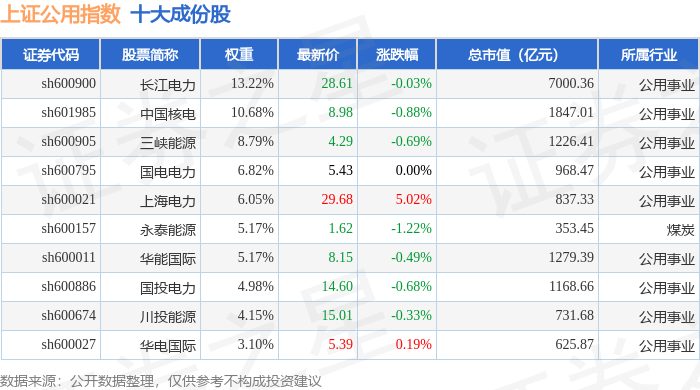 上证公用(000041)指数十大成份股详情如下: