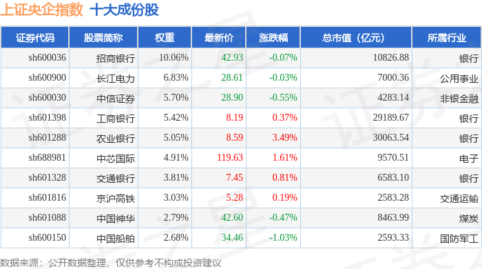 证券之星消息,11月12日,上证央企(000042)指数报收于1863.58点,涨0.38%,成交776.59亿元,换手率0.32%。当日该指数成份股中,上涨的有23家,中国铝业以6.65%的涨幅领涨,下跌的有25家,国电南瑞以3.64%的跌幅领跌。