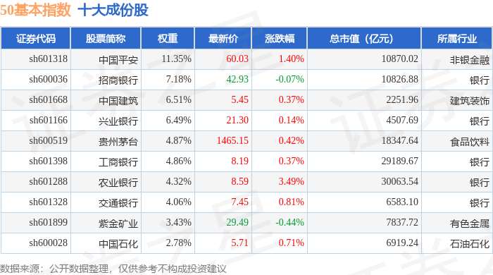 证券之星消息,11月12日,50基本(000052)指数报收于3035.86点,涨0.49%,成交1368.9亿元,换手率0.34%。当日该指数成份股中,上涨的有26家,中国铝业以6.65%的涨幅领涨,下跌的有24家,隆基绿能以7.35%的跌幅领跌。