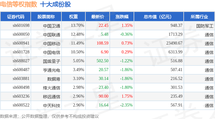 证券之星消息,11月12日,电信等权(000078)指数报收于3308.02点,跌0.23%,成交172.11亿元,换手率0.68%。当日该指数成份股中,上涨的有10家,信科移动以3.09%的涨幅领涨,下跌的有18家,中国电影以7.35%的跌幅领跌。
