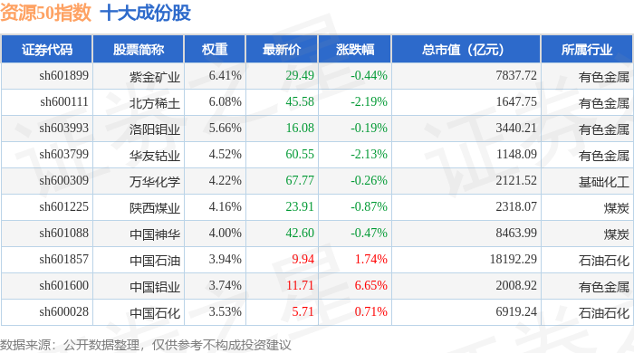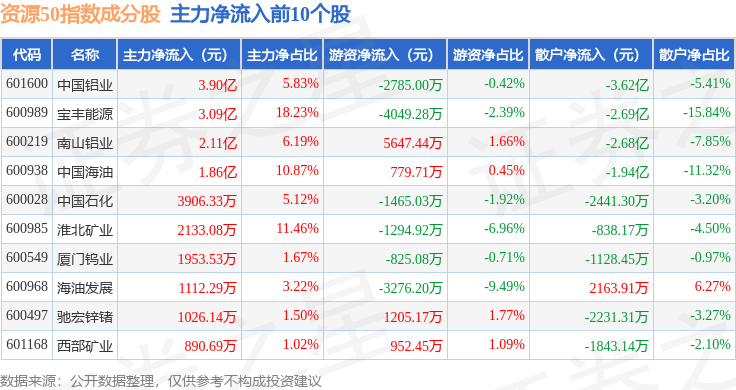 资金流向方面,资源50(000092)指数成份股当日主力资金净流出合计22.24亿元,游资资金净流入合计4.09亿元,散户资金净流入合计18.15亿元。成份股资金流向详情见下表:
