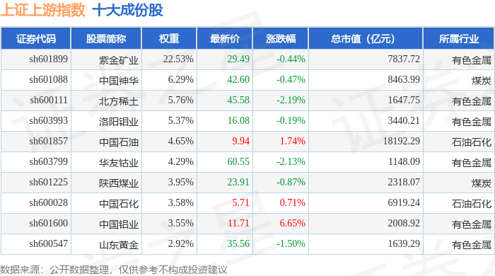 证券之星消息,11月12日,上证上游(000094)指数报收于4262.73点,跌0.24%,成交533.42亿元,换手率0.81%。当日该指数成份股中,上涨的有16家,中国铝业以6.65%的涨幅领涨,下跌的有30家,方大炭素以5.06%的跌幅领跌。