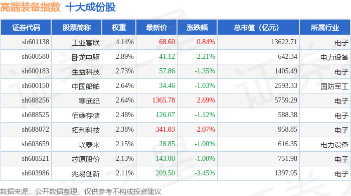 证券之星消息,11月12日,高端装备(000097)指数报收于11408.72点,跌2.07%,成交1440.11亿元,换手率2.1%。当日该指数成份股中,上涨的有11家,江淮汽车以5.63%的涨幅领涨,下跌的有48家,阿特斯以14.33%的跌幅领跌。