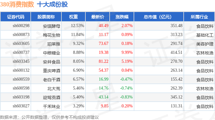 证券之星消息,11月12日,380消费(000108)指数报收于12806.67点,涨1.6%,成交62.73亿元,换手率1.33%。当日该指数成份股中,上涨的有11家,中粮糖业以9.99%的涨幅领涨,下跌的有8家,金徽酒以1.32%的跌幅领跌。