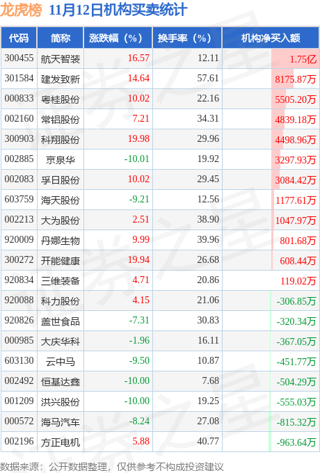 当日公布的交易所龙虎榜中有机构专用席位现身的个股共33家,其中航天智装以净买入1.75亿元排名第一。详情见下表:
