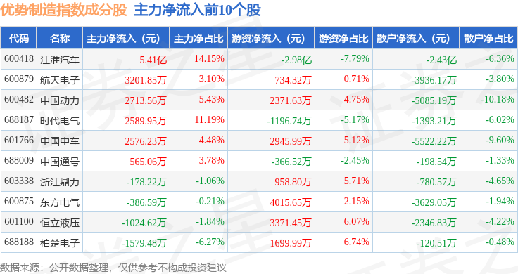 资金流向方面,优势制造(000146)指数成份股当日主力资金净流出合计79.39亿元,游资资金净流入合计17.17亿元,散户资金净流入合计62.21亿元。成份股资金流向详情见下表: