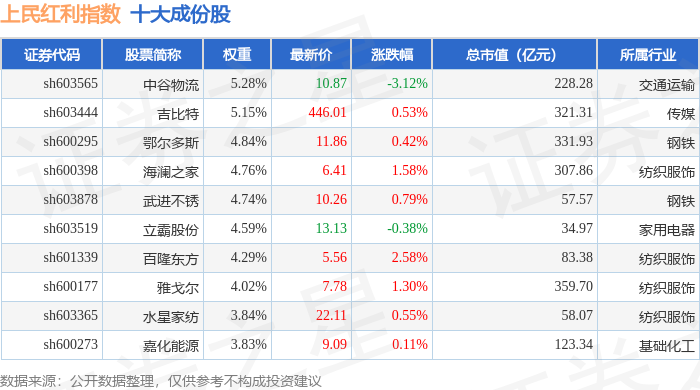 证券之星消息,11月12日,上民红利(000153)指数报收于3247.75点,涨0.1%,成交48.17亿元,换手率1.07%。当日该指数成份股中,上涨的有19家,百隆东方以2.58%的涨幅领涨,下跌的有11家,中谷物流以3.12%的跌幅领跌。