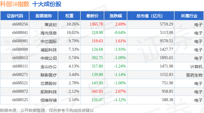 证券之星消息,11月12日,科创50(000688)指数报收于1379.45点,跌0.58%,成交618.53亿元,换手率1.94%。当日该指数成份股中,上涨的有18家,九号公司以3.62%的涨幅领涨,下跌的有31家,阿特斯以14.33%的跌幅领跌。