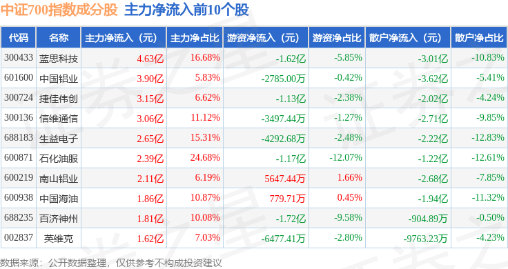 资金流向方面,中证700(000907)指数成份股当日主力资金净流出合计284.96亿元,游资资金净流入合计48.43亿元,散户资金净流入合计236.53亿元。成份股资金流向详情见下表: