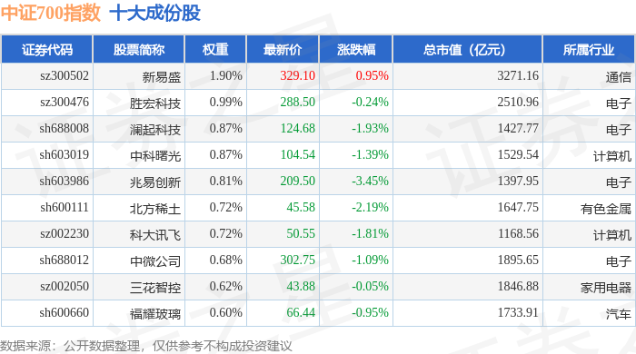 证券之星消息,11月12日,中证700(000907)指数报收于6353.34点,跌0.76%,成交5594.17亿元,换手率1.48%。当日该指数成份股中,上涨的有212家,石化油服以10.21%的涨幅领涨,下跌的有469家,阿特斯以14.33%的跌幅领跌。