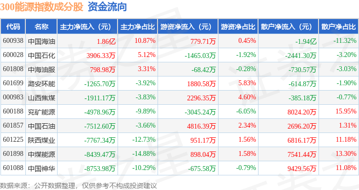 资金流向方面,300能源(000908)指数成份股当日主力资金净流出合计1.73亿元,游资资金净流入合计6367.97万元,散户资金净流入合计1.09亿元。成份股资金流向详情见下表: