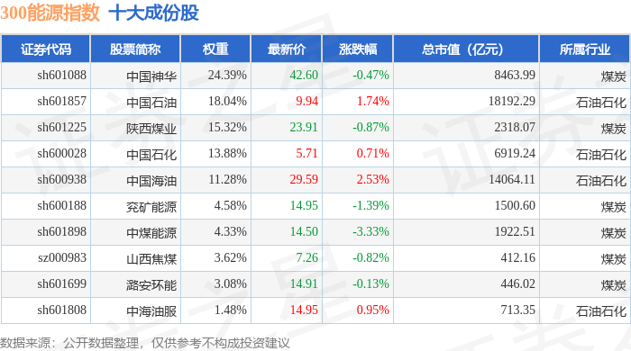 证券之星消息,11月12日,300能源(000908)指数报收于2427.81点,涨0.23%,成交81.28亿元,换手率0.2%。当日该指数成份股中,上涨的有4家,中国海油以2.53%的涨幅领涨,下跌的有6家,中煤能源以3.33%的跌幅领跌。