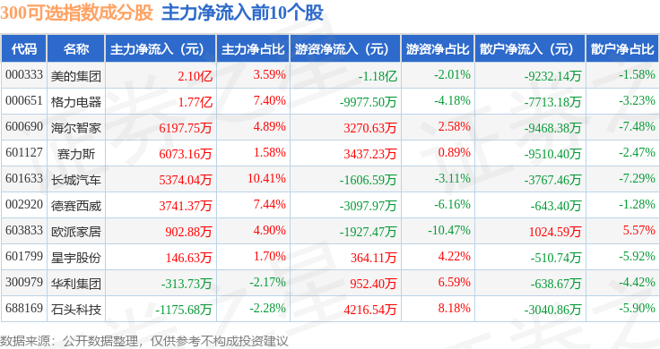 资金流向方面,300可选(000911)指数成份股当日主力资金净流出合计11.48亿元,游资资金净流入合计4.67亿元,散户资金净流入合计6.81亿元。成份股资金流向详情见下表: