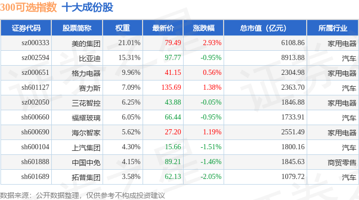 证券之星消息,11月12日,300可选(000911)指数报收于6589.55点,涨0.41%,成交394.12亿元,换手率0.96%。当日该指数成份股中,上涨的有10家,美的集团以2.93%的涨幅领涨,下跌的有11家,拓普集团以2.05%的跌幅领跌。