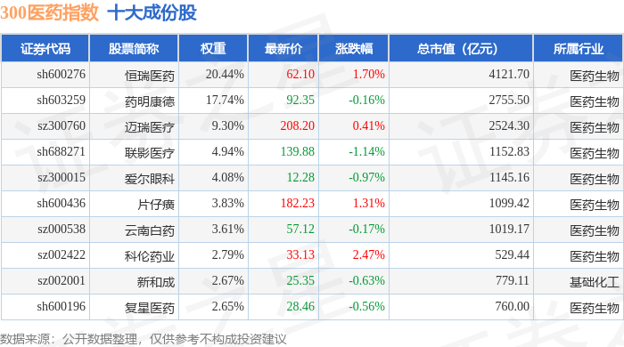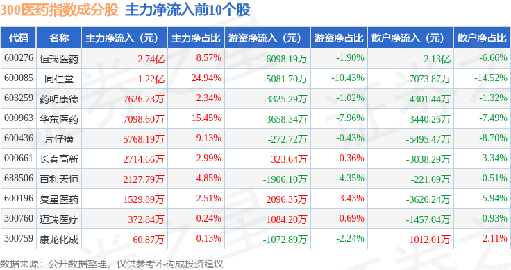 资金流向方面,300医药(000913)指数成份股当日主力资金净流入合计2.62亿元,游资资金净流出合计1.1亿元,散户资金净流出合计1.52亿元。成份股资金流向详情见下表: