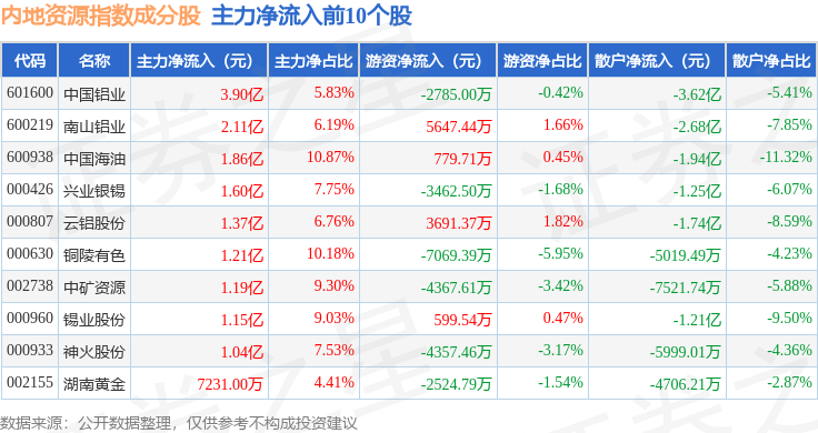 资金流向方面,内地资源(000944)指数成份股当日主力资金净流出合计13.77亿元,游资资金净流入合计1.05亿元,散户资金净流入合计12.72亿元。成份股资金流向详情见下表: