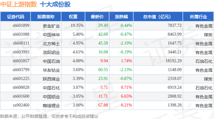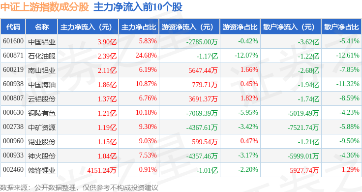 资金流向方面,中证上游(000961)指数成份股当日主力资金净流出合计12.32亿元,游资资金净流入合计612.39万元,散户资金净流入合计12.25亿元。成份股资金流向详情见下表: