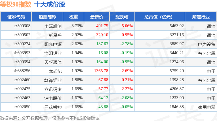 证券之星消息,11月12日,等权90(000971)指数报收于3340.24点,跌0.08%,成交2882.65亿元,换手率0.46%。当日该指数成份股中,上涨的有37家,中国铝业以6.65%的涨幅领涨,下跌的有52家,隆基绿能以7.35%的跌幅领跌。