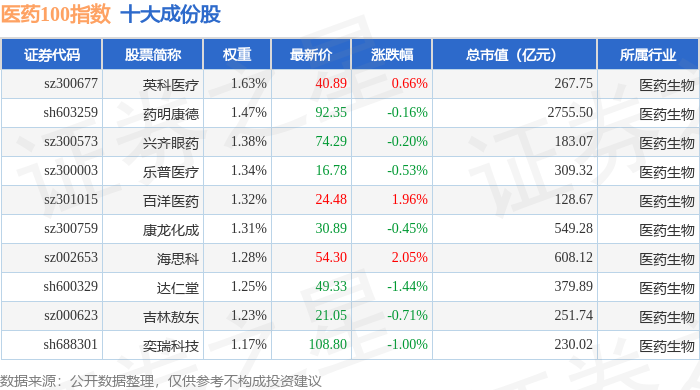 医药100(000978)指数十大成份股详情如下:
