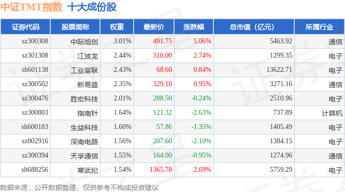 证券之星消息,11月12日,中证TMT(000998)指数报收于2847.28点,跌0.57%,成交2202.22亿元,换手率1.28%。当日该指数成份股中,上涨的有28家,中际旭创以5.06%的涨幅领涨,下跌的有71家,三环集团以5.21%的跌幅领跌。