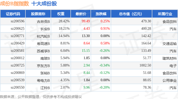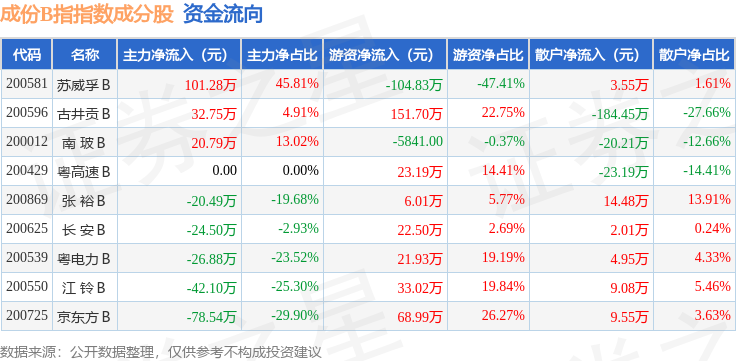 资金流向方面,成份B指(399003)指数成份股当日主力资金净流出合计37.69万元,游资资金净流入合计221.93万元,散户资金净流出合计184.24万元。成份股资金流向详情见下表: