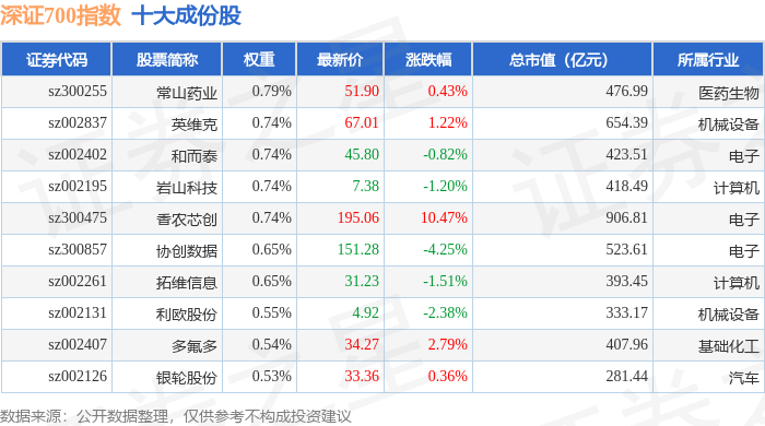 证券之星消息,11月12日,深证700(399010)指数报收于8611.97点,跌0.74%,成交3095.4亿元,换手率3.26%。当日该指数成份股中,上涨的有198家,航天智装以16.57%的涨幅领涨,下跌的有487家,英唐智控以8.25%的跌幅领跌。