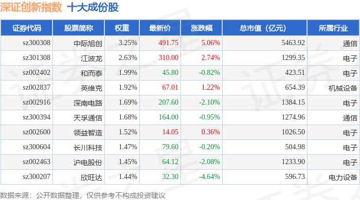 证券之星消息,11月12日,深证创新(399016)指数报收于5546.78点,跌0.65%,成交1366.34亿元,换手率2.0%。当日该指数成份股中,上涨的有33家,中际旭创以5.06%的涨幅领涨,下跌的有67家,三环集团以5.21%的跌幅领跌。