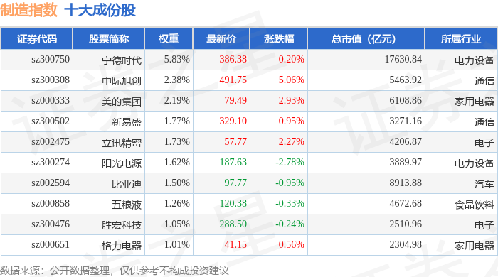 证券之星消息,11月12日,制造指数(399233)报收于3395.2点,跌0.4%,成交8260.3亿元,换手率3.51%。当日该指数成份股中,上涨的有619家,博晖创新以20.0%的涨幅领涨,下跌的有1288家,京泉华以10.01%的跌幅领跌。