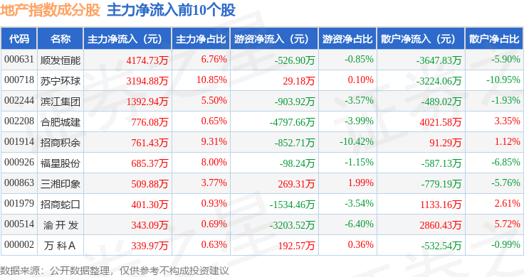资金流向方面,地产指数(399241)成份股当日主力资金净流出合计3.86亿元,游资资金净流出合计1.06亿元,散户资金净流入合计4.91亿元。成份股资金流向详情见下表: