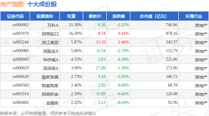 地产指数(399241)十大成份股详情如下: