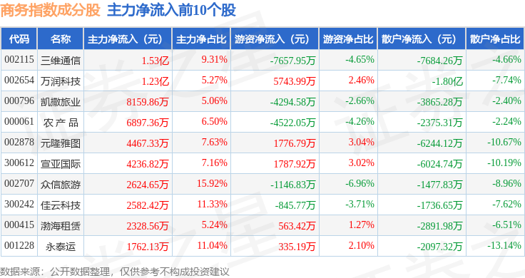 资金流向方面,商务指数(399242)成份股当日主力资金净流出合计1.5亿元,游资资金净流入合计9374.36万元,散户资金净流入合计5601.9万元。成份股资金流向详情见下表: