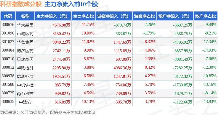 资金流向方面,科研指数(399243)成份股当日主力资金净流出合计6535.44万元,游资资金净流入合计1.69亿元,散户资金净流出合计1.04亿元。成份股资金流向详情见下表: