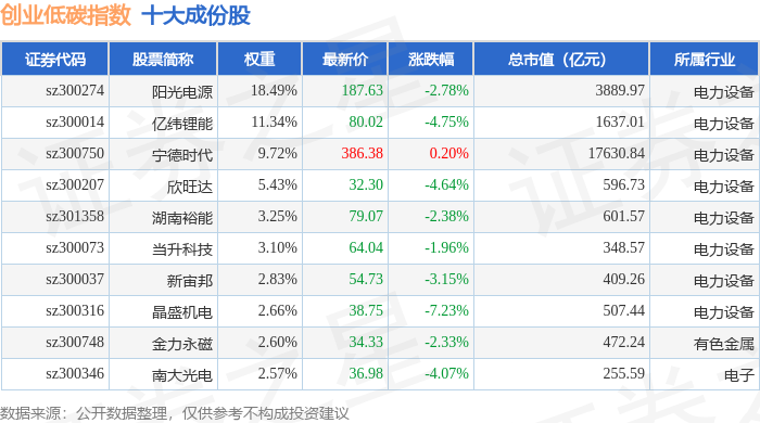 证券之星消息,11月12日,创业低碳(399259)指数报收于5169.8点,跌2.66%,成交696.05亿元,换手率4.9%。当日该指数成份股中,上涨的有8家,曼恩斯特以6.71%的涨幅领涨,下跌的有42家,晶盛机电以7.23%的跌幅领跌。