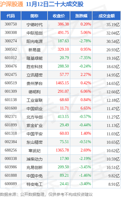 当日北向资金余额额度充足,中利集团(002309)领涨,涨幅10.03%,交易所公布的沪深股通二十大成交股中成交额前三的为宁德时代、中际旭创、阳光电源,成交额分别为35.19亿元、32.04亿元、30.54亿元。详情可见下表: