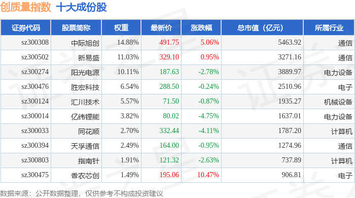 证券之星消息,11月12日,创质量(399269)指数报收于7650.91点,跌0.14%,成交1415.27亿元,换手率3.23%。当日该指数成份股中,上涨的有25家,香农芯创以10.47%的涨幅领涨,下跌的有74家,锦浪科技以6.77%的跌幅领跌。