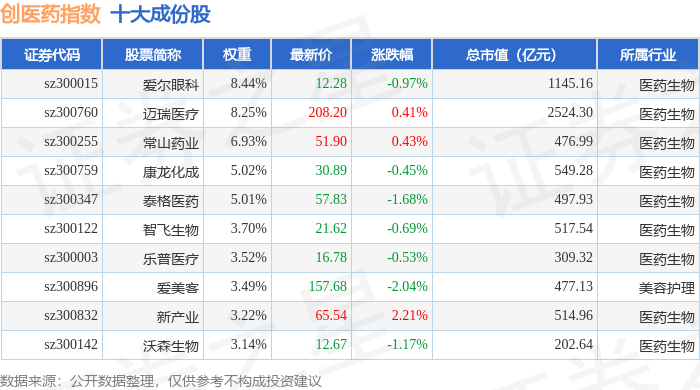 创医药(399275)指数十大成份股详情如下: