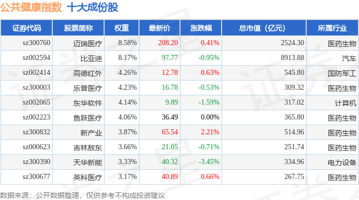 公共健康(399277)指数十大成份股详情如下: