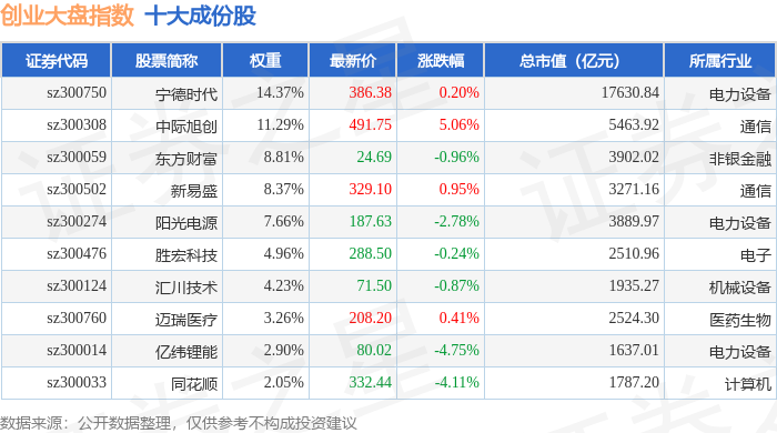证券之星消息,11月12日,创业大盘(399293)指数报收于6264.54点,跌0.42%,成交1290.53亿元,换手率1.96%。当日该指数成份股中,上涨的有13家,中际旭创以5.06%的涨幅领涨,下跌的有37家,晶盛机电以7.23%的跌幅领跌。