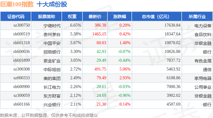 证券之星消息,11月12日,巨潮100(399313)指数报收于5494.74点,涨0.25%,成交2472.6亿元,换手率0.39%。当日该指数成份股中,上涨的有44家,中际旭创以5.06%的涨幅领涨,下跌的有55家,隆基绿能以7.35%的跌幅领跌。