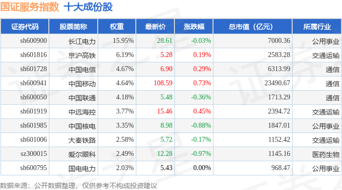 证券之星消息,11月12日,国证服务(399320)指数报收于2255.09点,跌0.12%,成交351.98亿元,换手率0.57%。当日该指数成份股中,上涨的有35家,上海电力以5.02%的涨幅领涨,下跌的有61家,海峡股份以4.15%的跌幅领跌。